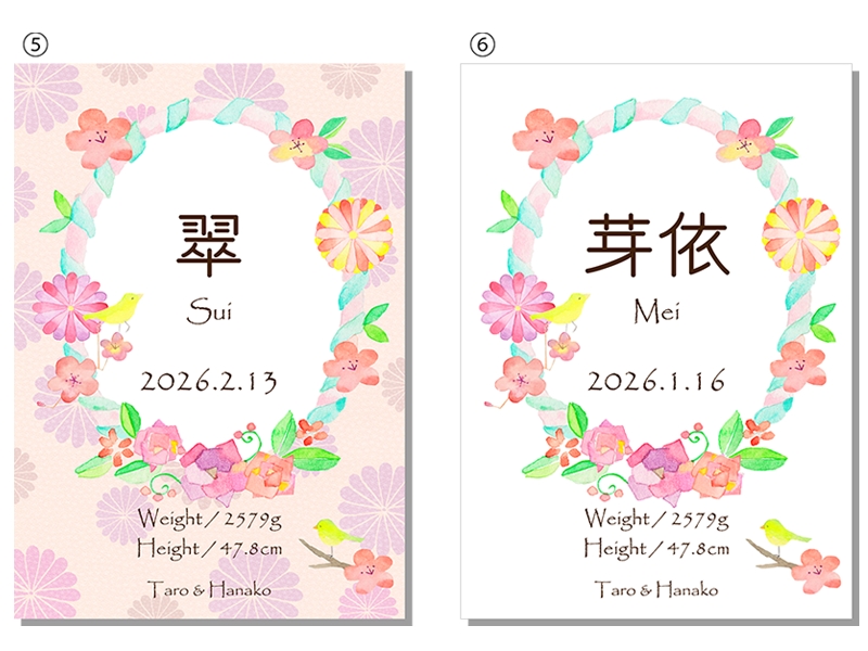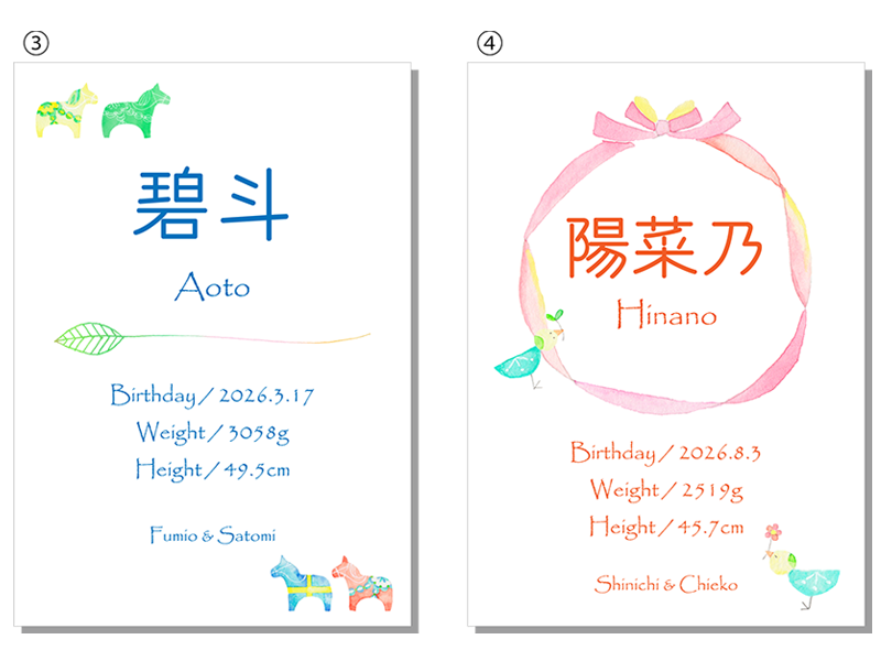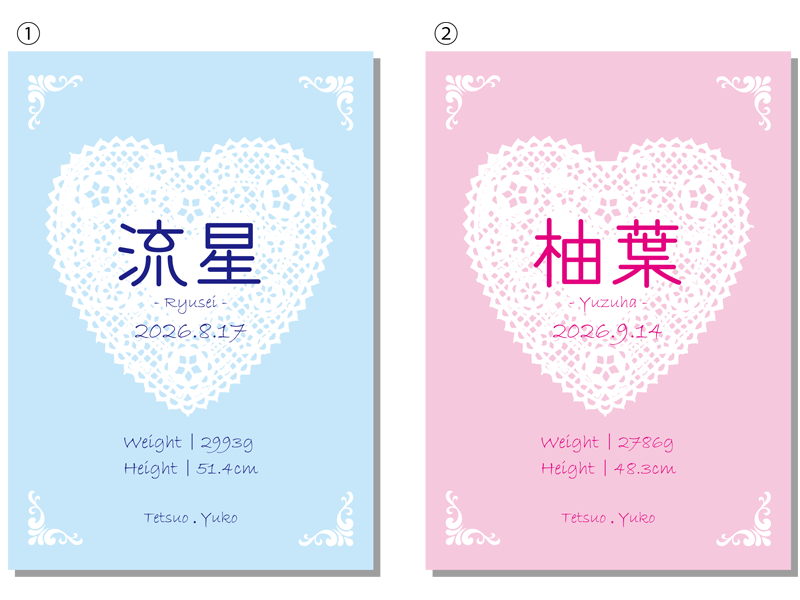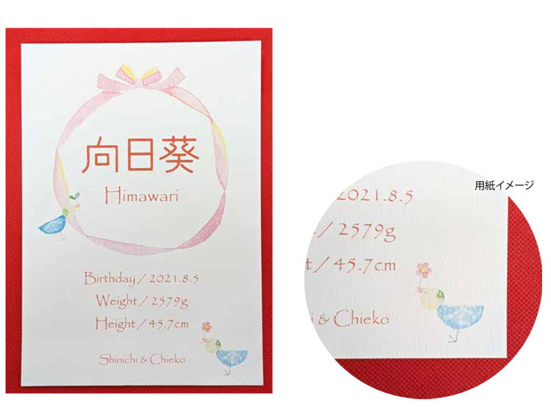 生年月日、お子様のお名前、父母のお名前入り